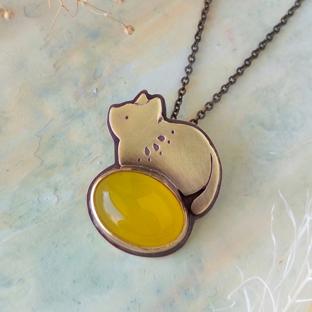 Material Collection 香箱座りの猫とイエローカルセドニーのペンダント 丸っこくて可愛らしい猫さんを 太陽の日差しのような色合いのカルセドニーの上にちょこんと乗せた真鍮製ペンダントです。 曲線を主体にしたシルエットなので、優しい印象を与えます。 猫や天然石、黄色がお好きな方におススメです。 真鍮を変色させて独特の色合いを出す事で、古い絵本に出てくるような あたたかくてどこか懐かしい空気をまとった作品に仕上げています。 物語の風景の一部を切り取ったような世界を感じていただけると嬉しいです。 ゜゚ *+:。.。:+* ゚ ゜゚ *+:。.。.。:+* ゚ ゜゚ *+:。.。:+* *+:。.。:+* ゚ ゜゚ *+:。.。.。:+* ゚ ゜゚ *+:。.。:+* ゚ ◇製法について 各パーツは真鍮の板から糸鋸を使って切り出したり、ワイヤー状の真鍮を加工して成形しています。 切り出して模様をつけた幾つものパーツをバーナーと少量の銀を使って溶接し、変色させて深みのある色合いに仕上げています。 猫の身体についている模様は、自分で制作した専用の工具を使って少しずつ丁寧に彫り入れています。 真鍮の表面はマットな質感に仕上げておりますので、ほっこりとした温かみのある風合いをお楽しみいただけます。 ゜゚ *+:。.。:+* ゚ ゜゚ *+:。.。.。:+* ゚ ゜゚ *+:。.。:+* *+:。.。:+* ゚ ゜゚ *+:。.。.。:+* ゚ ゜゚ *+:。.。:+* ゚ ペンダントトップの大きさ:タテ約2.8cm×ヨコ約2.5cm チェーンの長さ:着用画像は40cmのチェーンを使用しておりますが、40cm~70cmまでのお好きな長さでご注文いただけます。 「カートに入れる」ボタンの上のオプション欄からお選びください。 素材:真鍮、イエローカルセドニー、銀(チェーンとアクセサリー金具は市販のものですが、つなぎ目を少量の銀で溶接して丈夫にしております。) ゜゚ *+:。.。:+* ゚ ゜゚ *+:。.。.。:+* ゚ ゜゚ *+:。.。:+* *+:。.。:+* ゚ ゜゚ *+:。.。.。:+* ゚ ゜゚ *+:。.。:+* ゚ ゜ ※金属アレルギーの方はご使用をお控えください。 ※お使いのPCやスマホ等の画面によって、色彩など実物とは異なる場合がございます。 ※イメージの違いなどお客様都合での返品はお受けできませんので、ご了承ください。 ※一つ一つ手づくりの為、再販売の際には少しずつ作品の表情に違いがあることをご了承ください。 ※再販を承った際、石の仕入れ状況によっては同じ種類、色、大きさの石がご用意できない可能性がございます。その場合お値段は変わりますが他の石での制作をご提案させていただいております。 ※真鍮は時間の経過とともに深みのある色味に変化してまいります。経年変化をお楽しみいただけますが、全体的なくもりが気になる場合には、市販のシルバークロスで拭きあげていただきますと立体感が強調され、少しくっきりとした印象になります。 ※石に小傷やインクルージョンと呼ばれる内包物が見られる場合がございます。また、石によっては裏側の研磨が荒い場合がございます。あらかじめご了承のうえお買い求めください。 ※ペンダント作品のチェーン、金具部分は古美金メッキ加工が施してあります。真鍮の変色後の色味に合わせた仕様にしております。 ※ご登録の住所に不備があった場合は、商品が返送されてしまい再発送となってしまいます。その際に生じる送料は、お客様にご負担頂くかたちとなりますのでご注意ください。 Copyright (c) mag.jewelry 2025- All Rights Reserved.