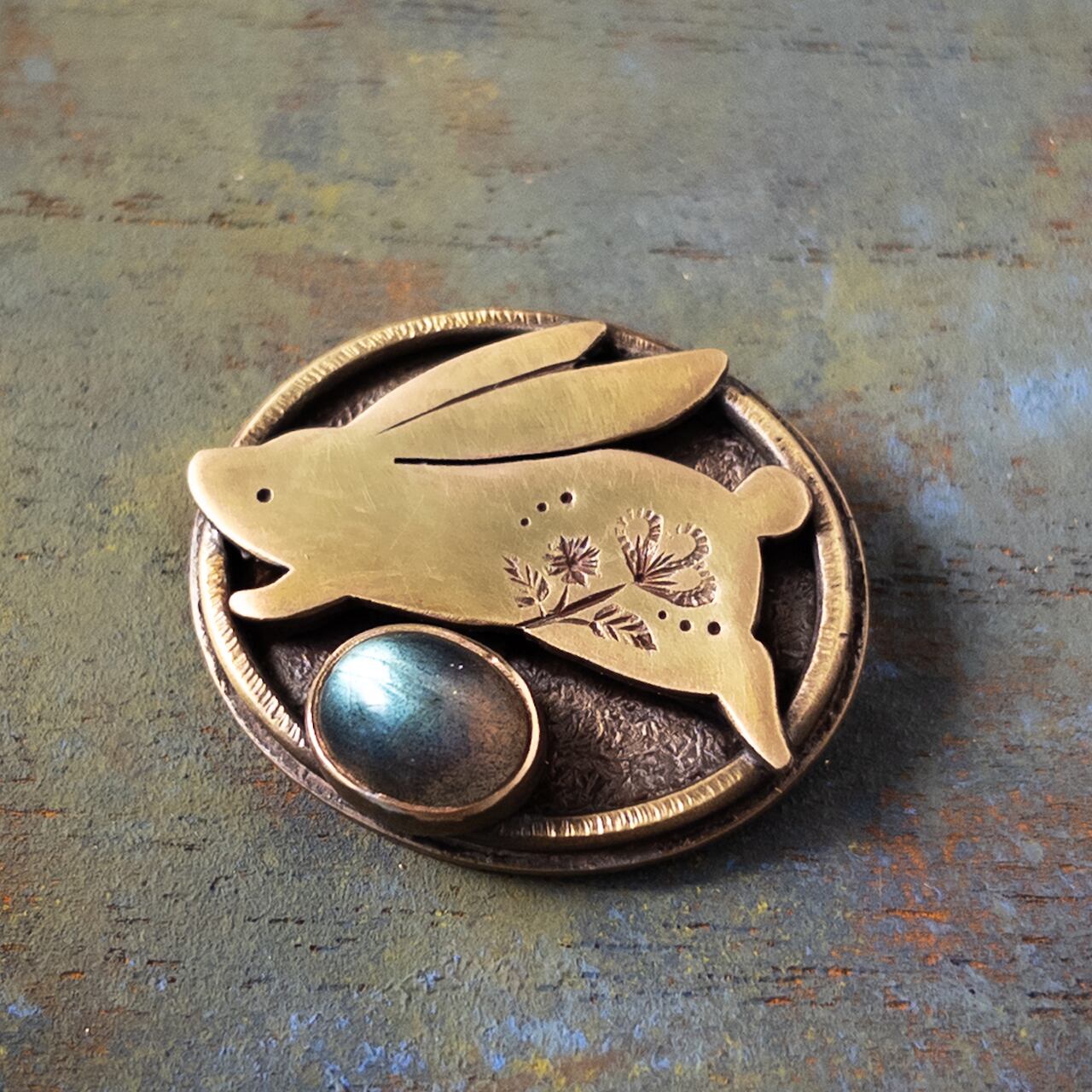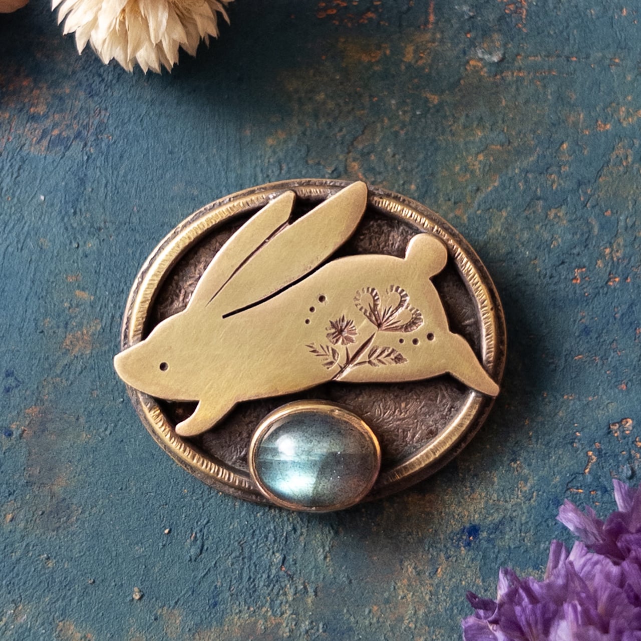 可愛らしいシルエットのウサギさんがラブラドライトの上を飛び越えている様子をデザインした真鍮製ブローチです。