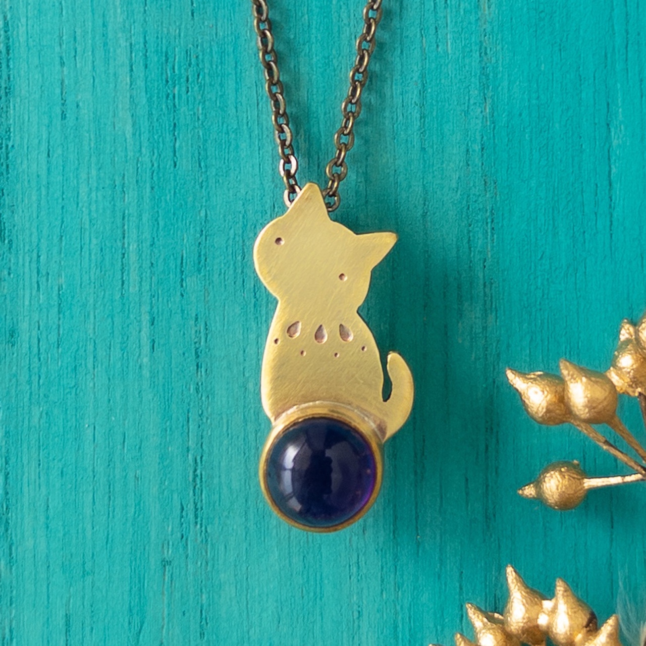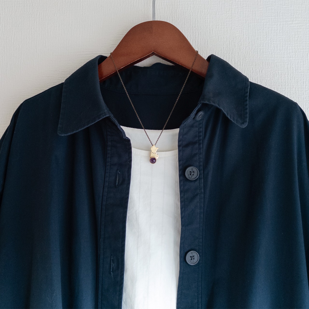 少し首をかしげている子猫さんと、深い紫色が素敵なアメシストを組み合わせたペンダントです。