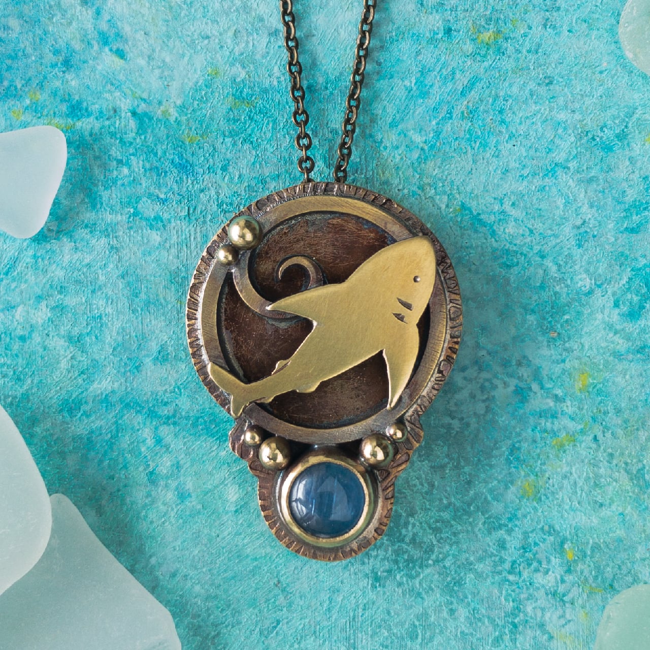 可愛らしいサメと、涼やかなブルーが魅力のカイヤナイトを組み合わせた真鍮製ペンダントです。