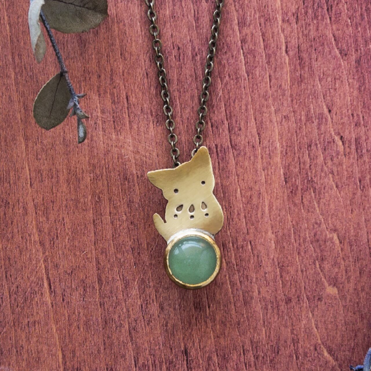 少し首をかしげている子猫さんに、瑞々しい草のようなグリーンが魅力のアベンチュリンをあしらった真鍮製ペンダントです。